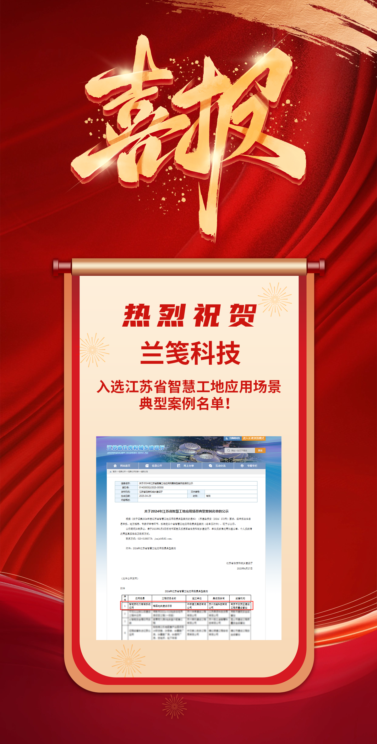 喜報(bào)!熱烈祝賀蘭箋科技入選江蘇省智慧工地應(yīng)用場(chǎng)景典型案例名單!
